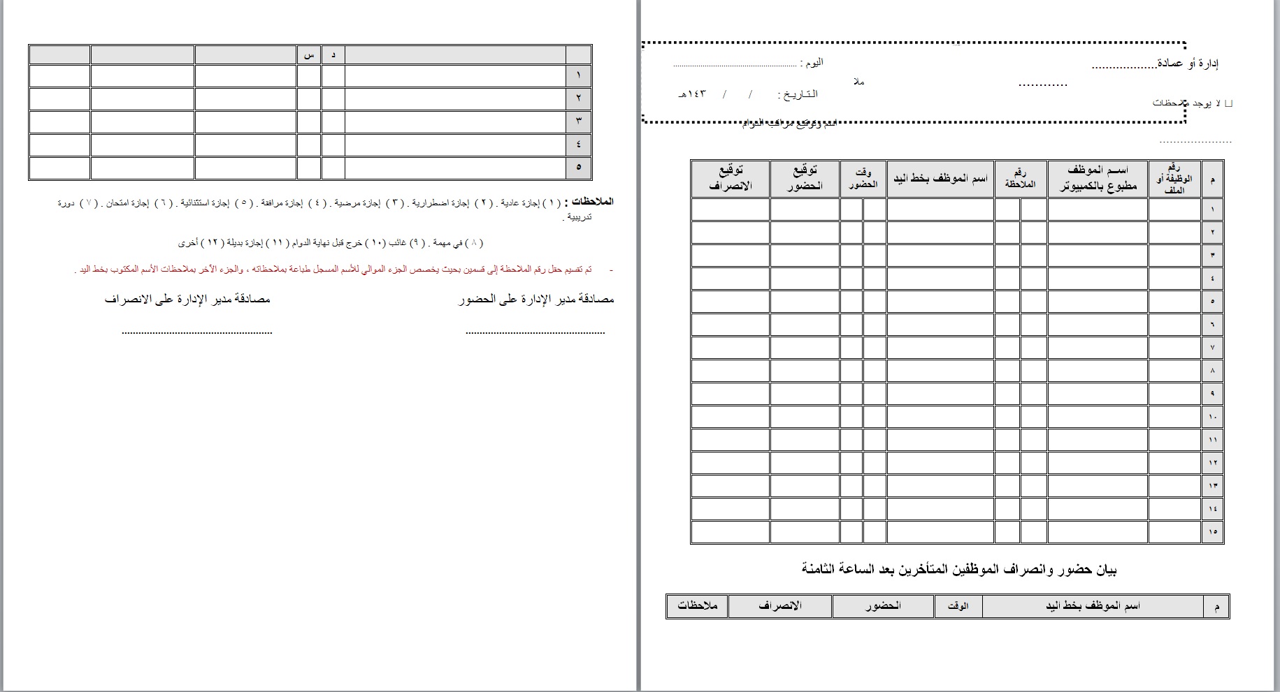 نموذج حضور وانصراف للموظفين بالسعودية جاهز للطباعة